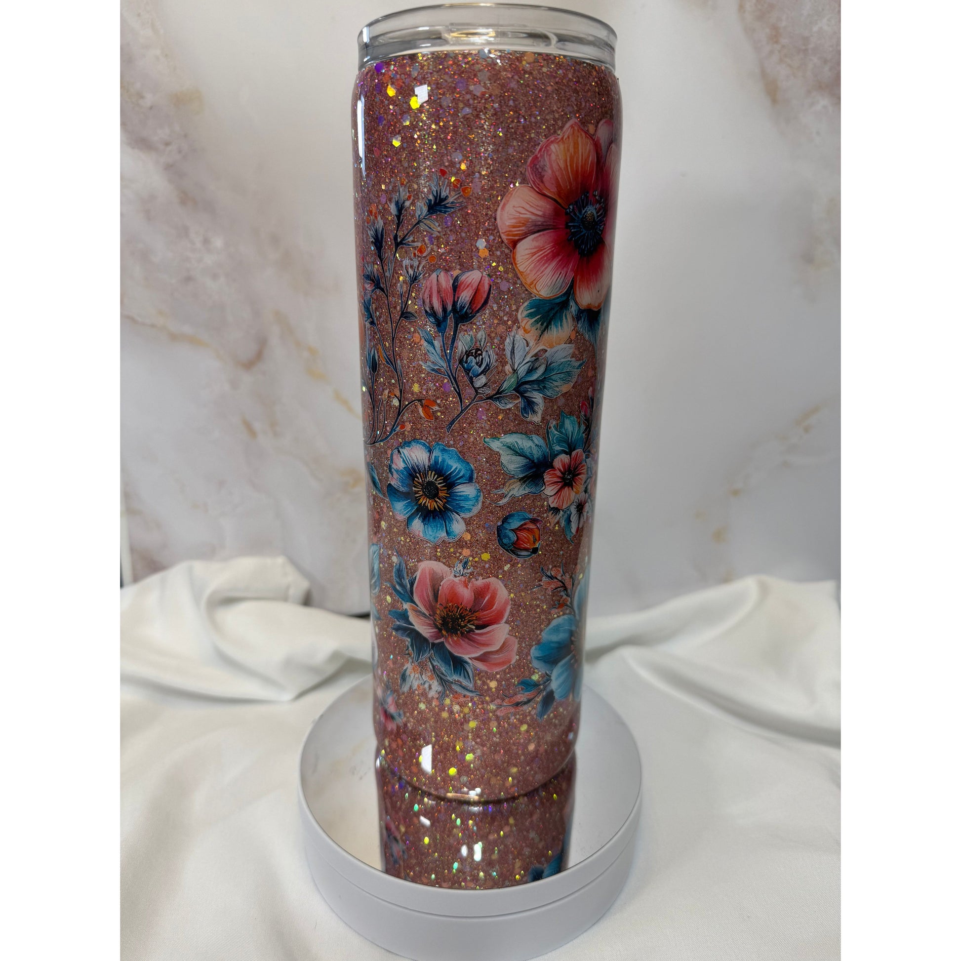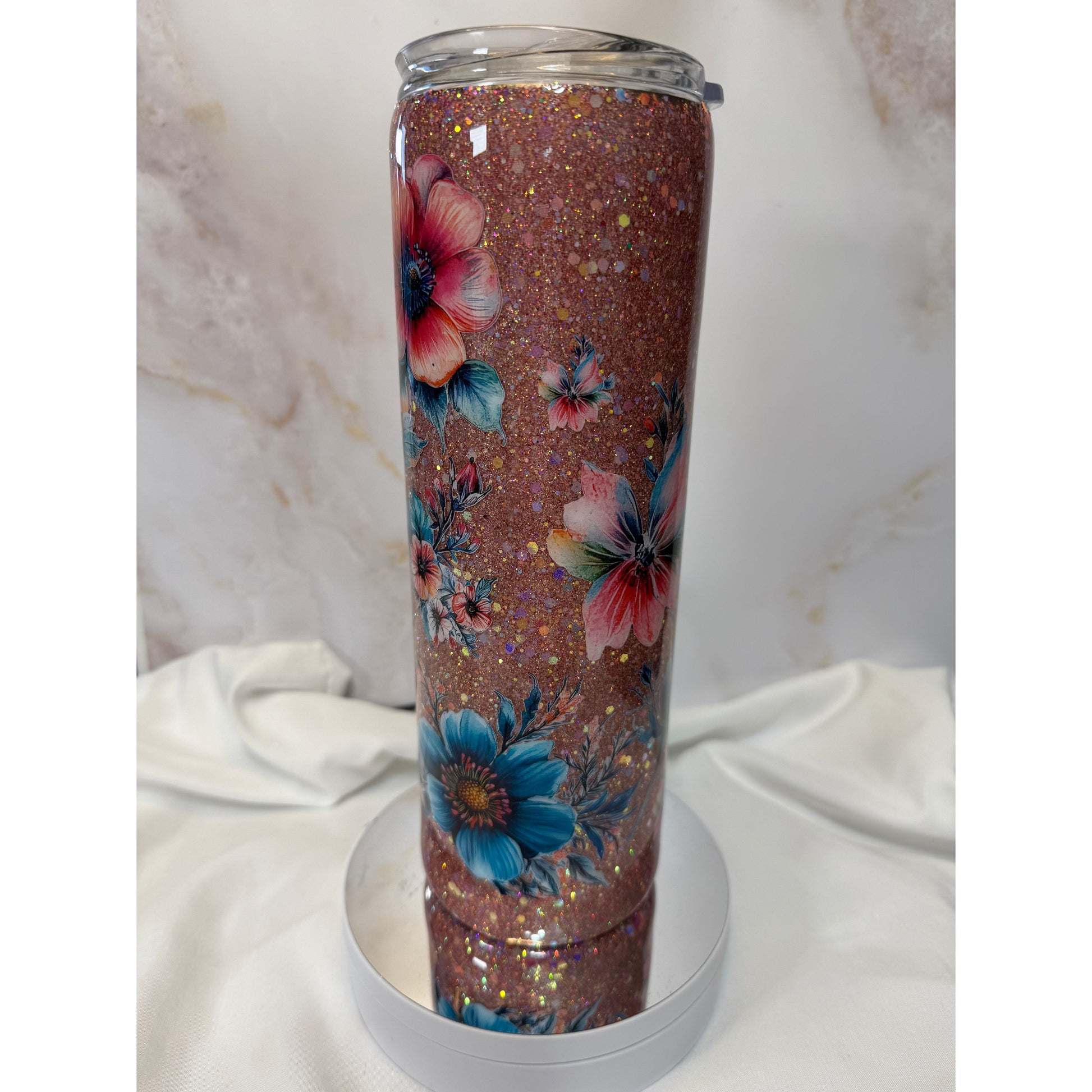 #503 Glitter Peach and Teal Flowers Stainless Steel Tumbler