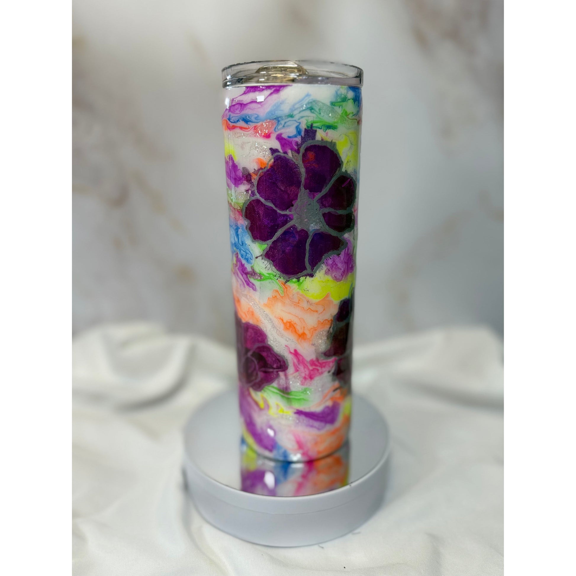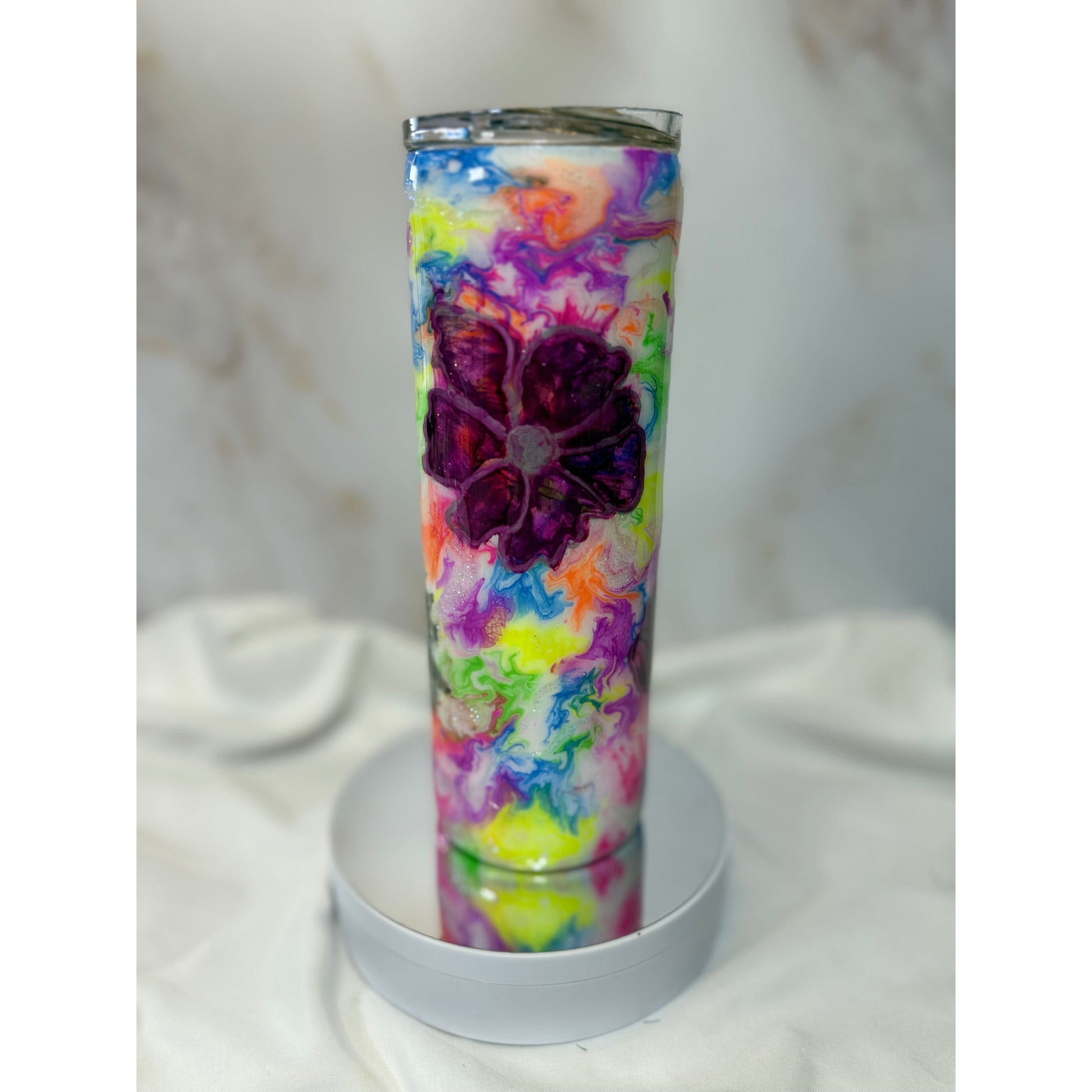 #531 Neon Drop Ink Swirl with Matching Purple Air Flowers 20oz Tumbler