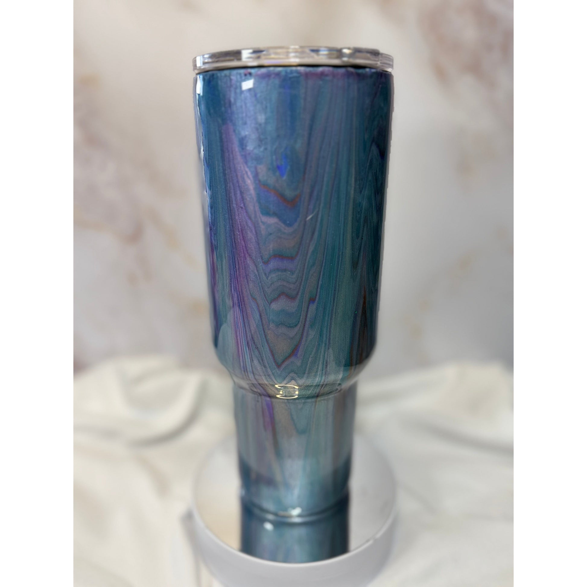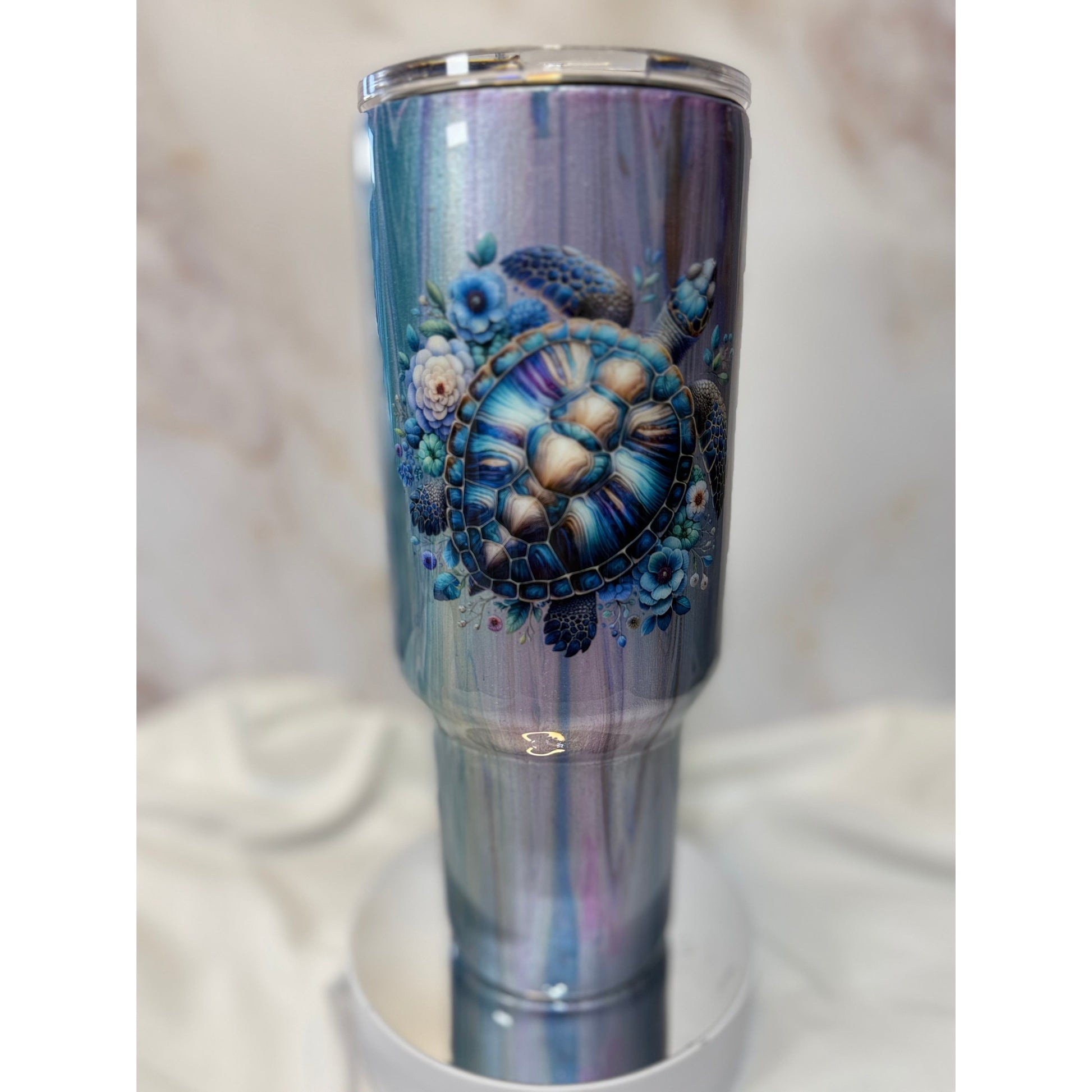 #527 Paint Pour in Purples and Blues with Turtle Design Tumbler
