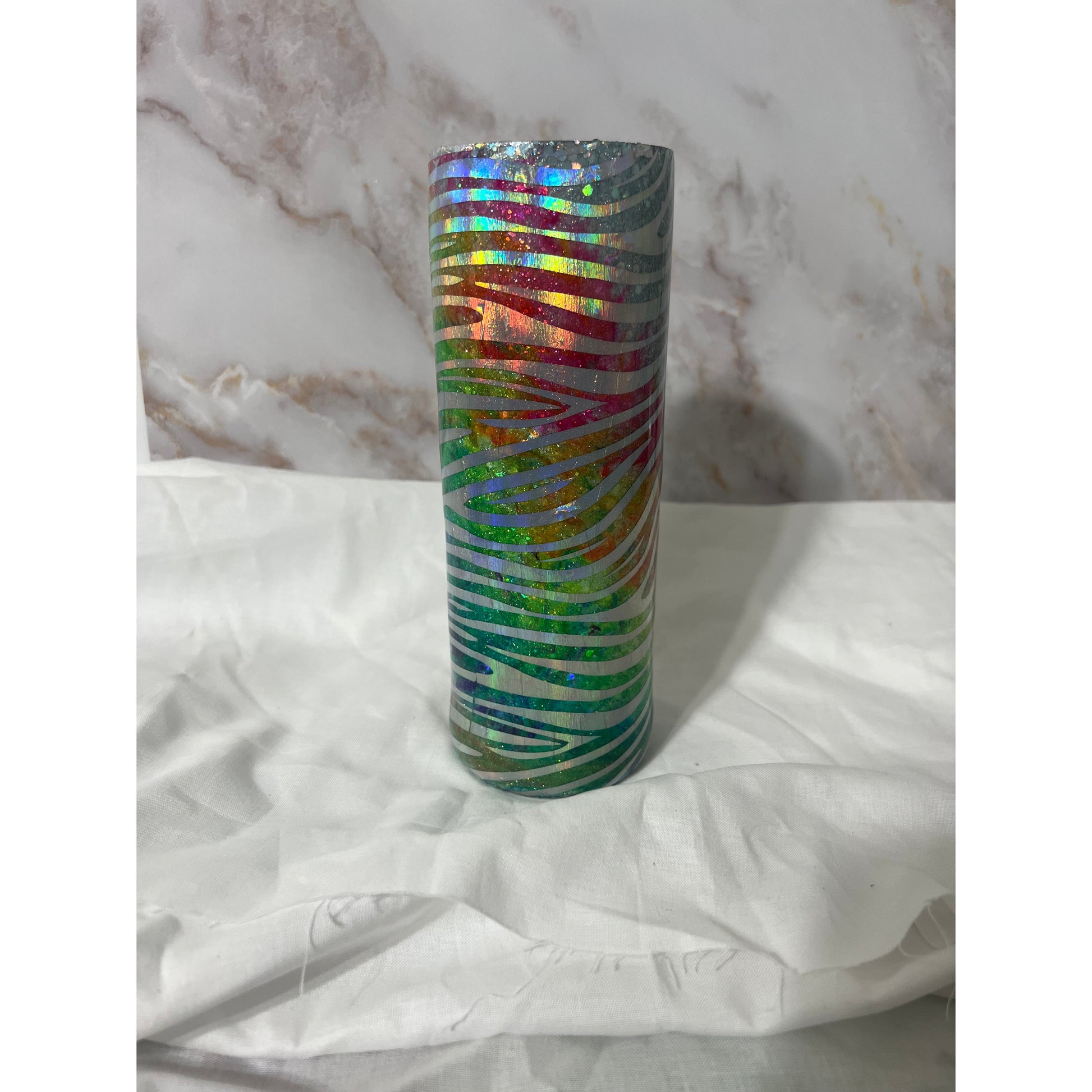 This sparkly rainbow foil is the base of this cup.  Then a gorgeous holographic zebra foil overlay is added over the cup!  Topped off with glitter of your choice.  This is a clear Zebra super holo foil can be added to any color, but looks incredible over rainbow glitter or rainbow foil.  This is a stunning cup!