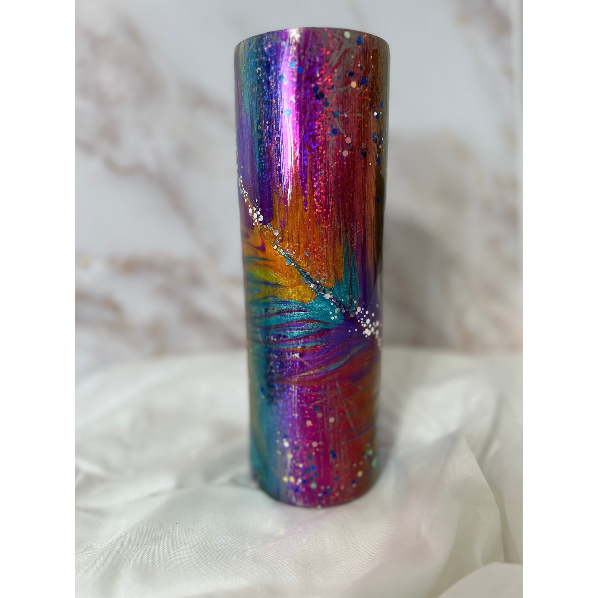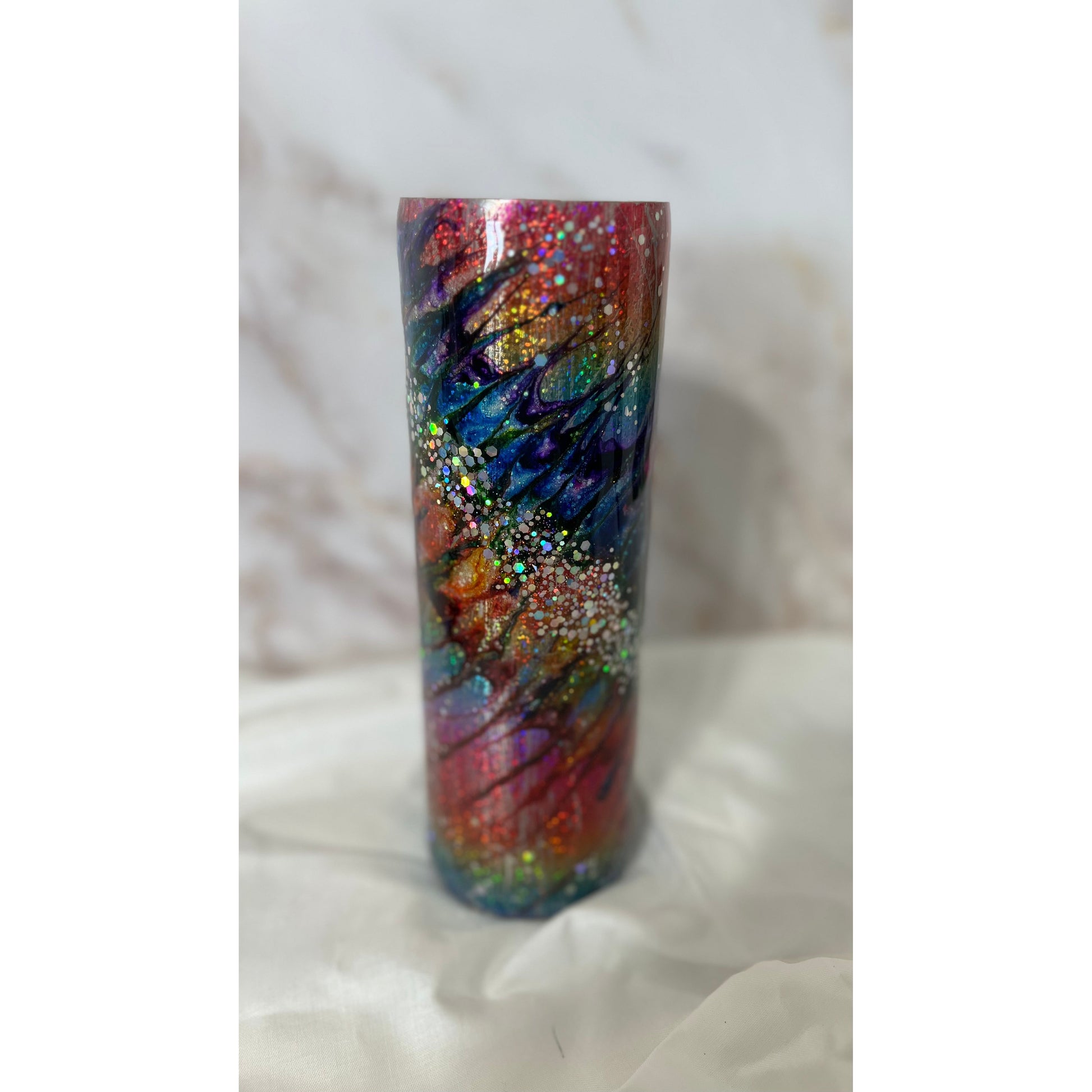 This gorgeous cup is made with rainbow glitter Foil, then painted with either Rainbow mica, Rainbow of colored inks or Rainbow of Glow Pigments in a feather or stinger design.