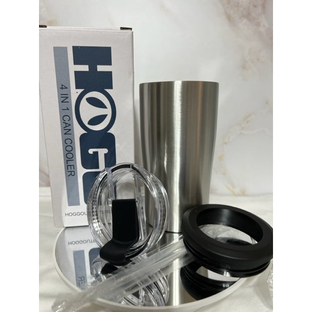 This is a 4 in 1 Stainless Steel Can Koozie. This Cup fits a Can, Bottle, Skinny Can and turns into a Drink Can with screw on lid, Flip open the lid and Straw fits into the Lid. These cups are double wall construction and make great gifts for those guys who have every thing!