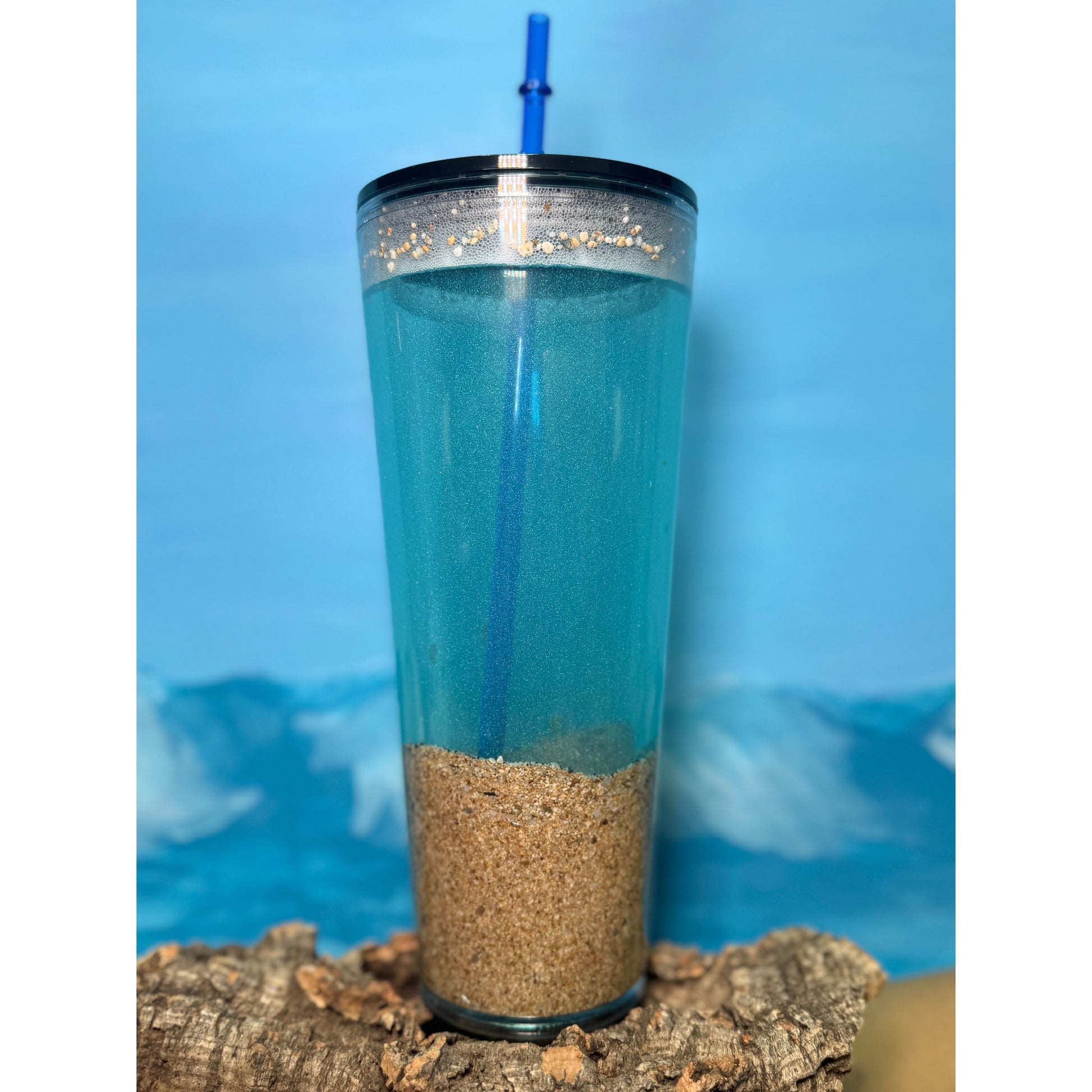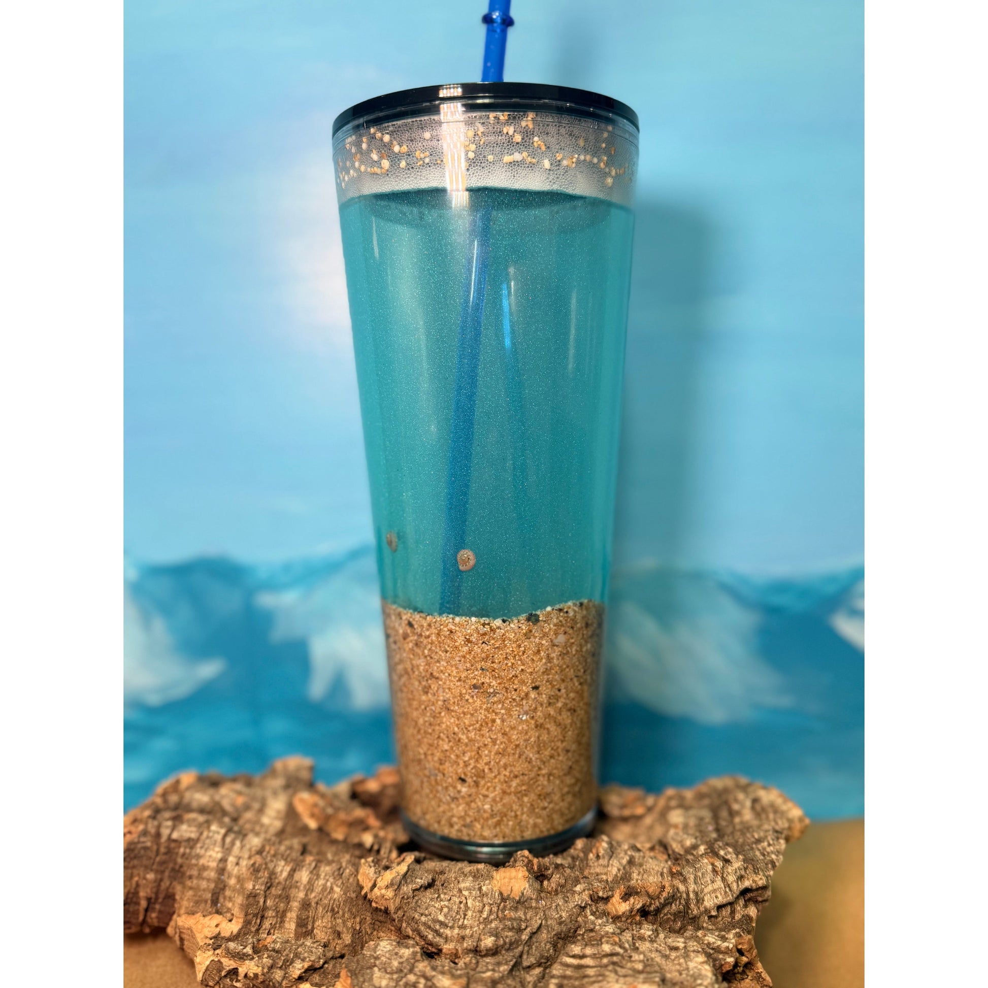 Ocean Globe Acrylic 24oz Tumbler with Hawaiian Sand, white Florida Gulf and Florida Atlantic Ocean with Crushed Abalone and sea shells