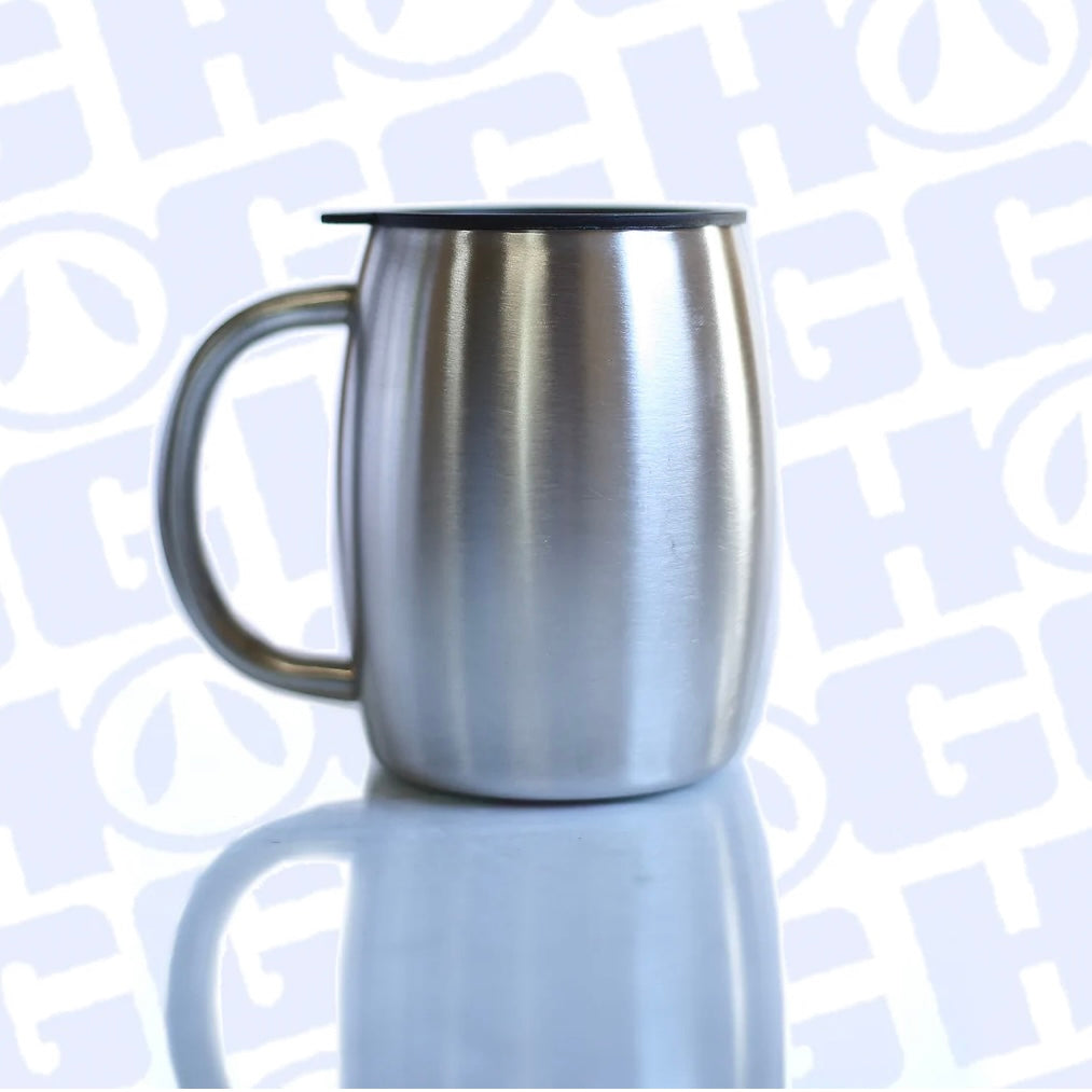 Stainless Steel Coffee Mug is 14 OZ. It has double wall construction, vacuum insulated, Black swivel closing top.